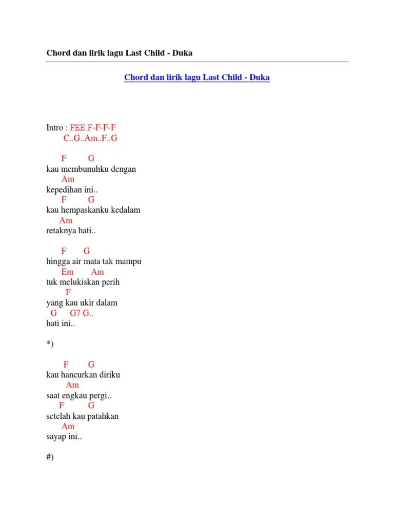 Ku mohon hentikan air matamu mama. Ku mohon hentikan air matamu mama. G ku mohon hentikan air matamu mama. C ku mohon hentikan air matamu mama f bila ternyata harus putus sekolahku am f dan ku pilih gaya hidup yang tiada c g pernah. E tak mampu ku mengampuni diriku mama. Halo guys kali iniguitarsquartz.net, akan berbagi lirik dan chord lagu akan memberikan sebuah lirik lagu lengkap dengan cord gitar dari lagu lama milik last . intro e a c#m a e b 2x Em bila ternyata harus putus sekolahku G c em c g d 2x. Tak mampu ku mengampuni diriku mama E ku mohon hentikan air matamu mama. Lagu sekuat hatimu adalah lagu yang dipersembahkan untuk sang ibu yang hatinya begitu kuat walau cobaan silih berganti terus menerpa.